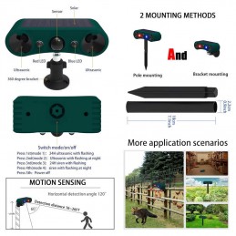 Αυτό το απωθητικό ζώων απωθεί με δυνατούς υπέρηχους που εκπέμπει ένα ευρύ φάσμα ζώων όπως γάτες, σκύλους, αλεπούδες, σκίουρους, ζαρκάδια, αρουραίους, ποντίκια και άλλα ζώα. Οι υπέρηχοι που εκπέμπει ο απωθητής ζώων ερμηνεύονται ως σήμα κινδύνου στα ζώα και αναγκάζονται να απομακρυνθούν αποτελεσματικά.