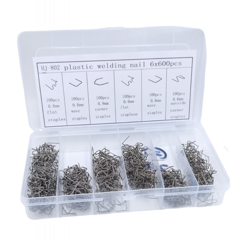 Κατάλληλα για πιστόλι συγκόλλησης επισκευής πλαστικών. Η συσκευασία περιέχει 600 συρραπτικά σύρματα σε έξι διαφορετικά σχήματα διαμέτρου 0.8mm.