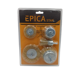 Σετ συρματόβουρτσες για δράπανο 5 τεμαχίων της εταιρείας Epica Star. Το σετ περιλαμβάνει 2 συρματόβουρτσες δίδυμου τροχού 50mm και 75mm, 2 συρματόβουρτσες καμπάνα 50mm και 75mm και 1 συρματόβουρτσα για δράπανο 25mm. Κατασκευασμένα από ανθεκτικό σίδηρο. Το ατσάλινο σύρμα έχει επένδυση από ορείχαλκο καθιστώντας το σετ κατάλληλο για καθαρισμό οποιασδήποτε μεταλλικής επιφάνειας, σκουριάς και μπογιές.